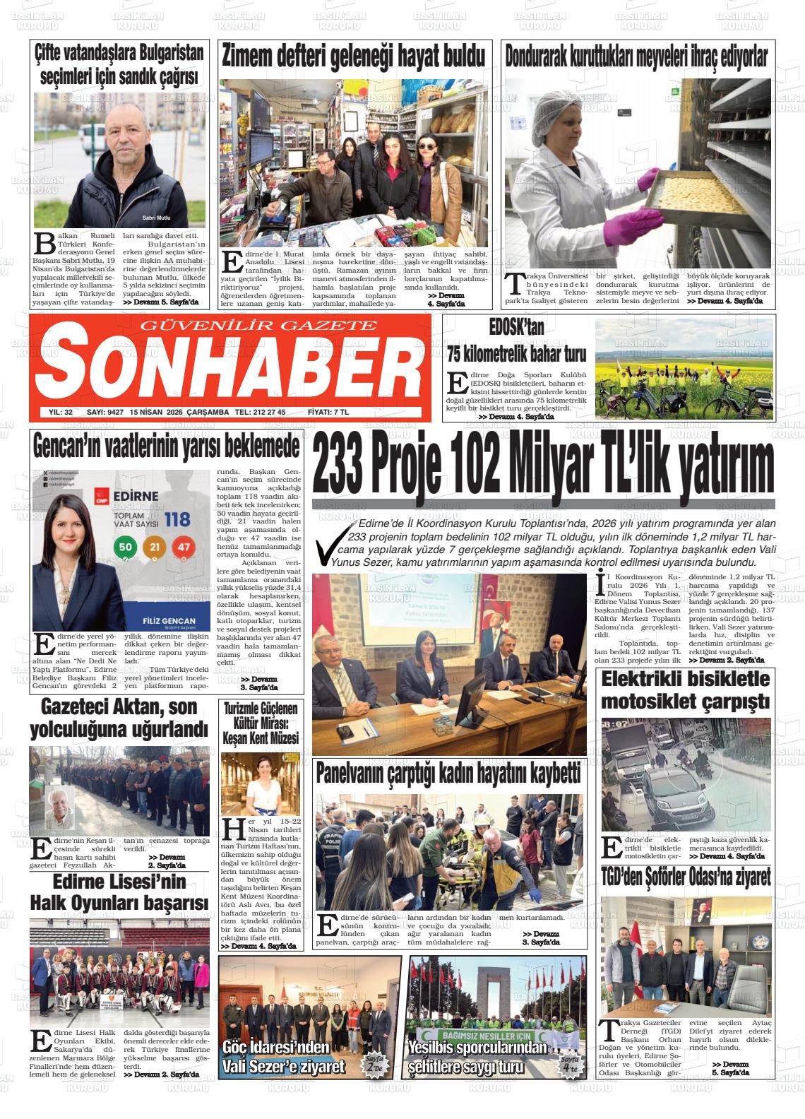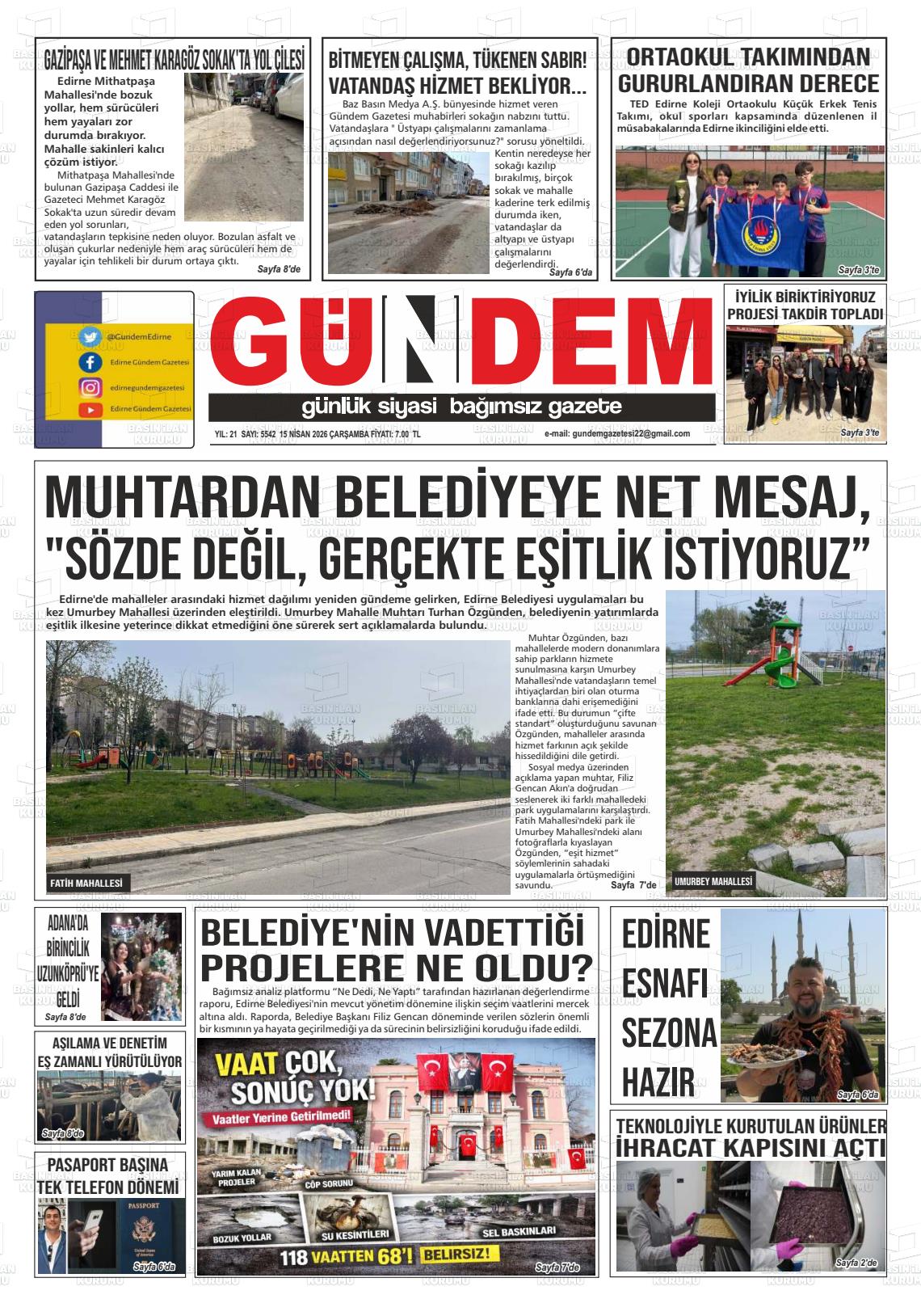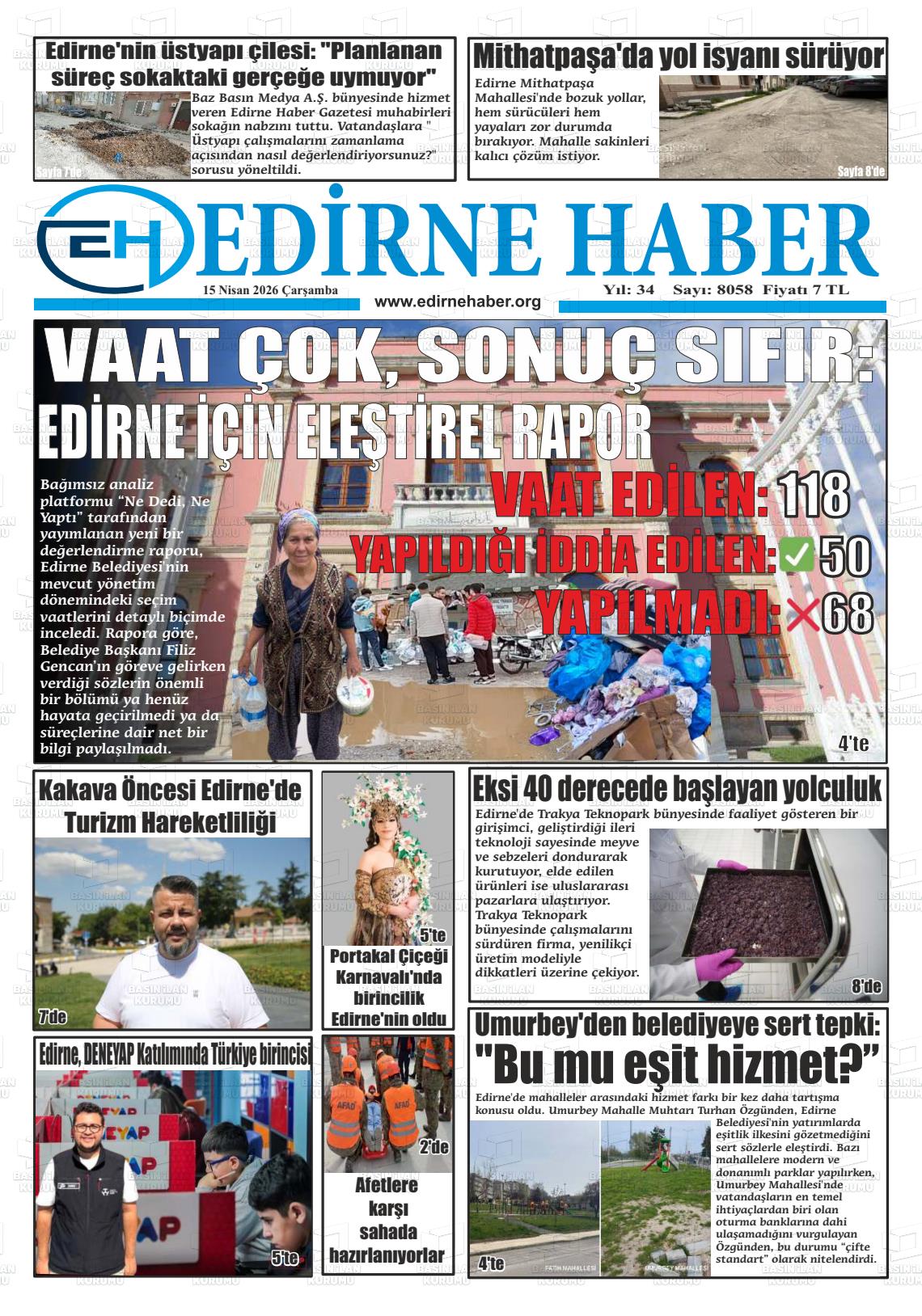 Edİrne Yerel Gazeteleri 15 Nisan 2026, Çarşamba Günü Manşeti